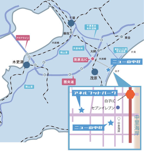 お車でお越しの場合 【京葉道路東京方面から】 京葉道路…千葉東JCT → 千葉東金有料道路…東金IC → 国道126号…成東方面へ → 東金九十九里有料道路…台方ICより九十九里方面へ → 九十九里ICより九十九里有料道路…一宮方面へ → 白子ICより3分 【横浜・川崎・木更津方面から】 アクアライン → 圏央道…茂原北IC → 県道21号線(4.3km)…本納交差点 左方向 → 国道128号線(0.9Km)…法目交差点 右方向 → 県道31号線(9.2Km)…古所海岸入口 右方向 (1.7Km)※茂原北ICからの一般道が分かりにくい場合は、圏央道をそのまま進み、1.の東金インターからのアクセスが分かりやすいです。